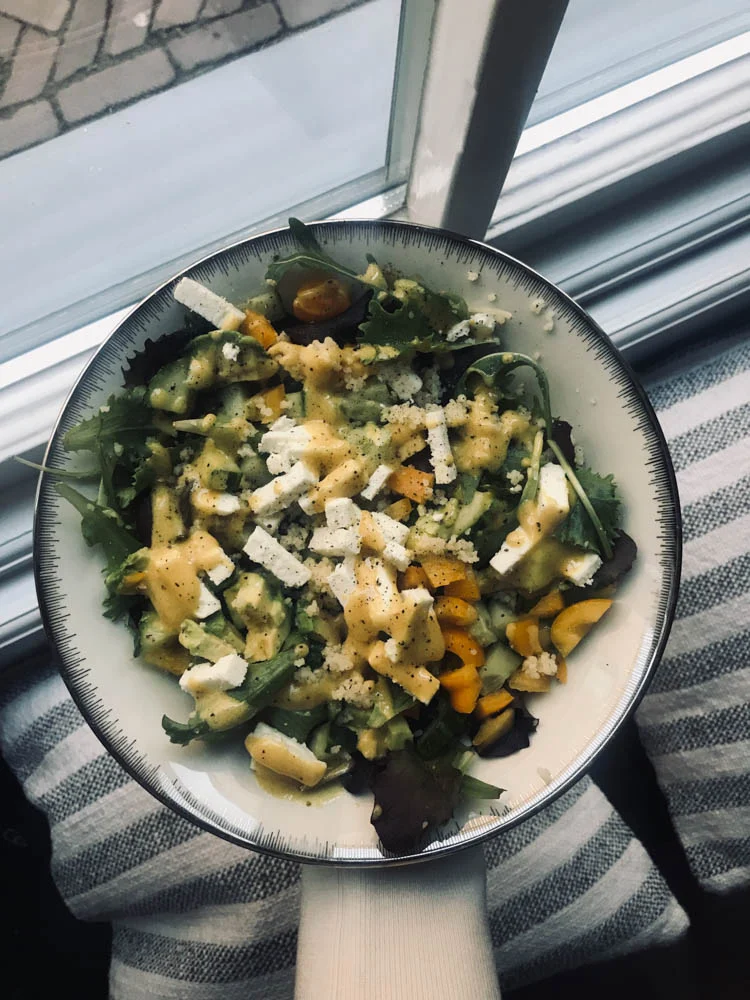 Ik had geen boodschappen gedaan maar ik had nog wel veel in huis wat ik prima in een salade kon gebruiken. Zodoende maakte ik deze salade met o.a. komkommer, paprika, feta en mosterddressing.