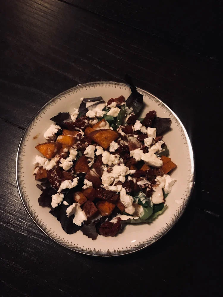Inmiddels wel boodschappen gedaan. Ik maakte dinsdag weer een salade maar nu met zoete aardappel, geitenkaas en zongedroogde tomaatjes.