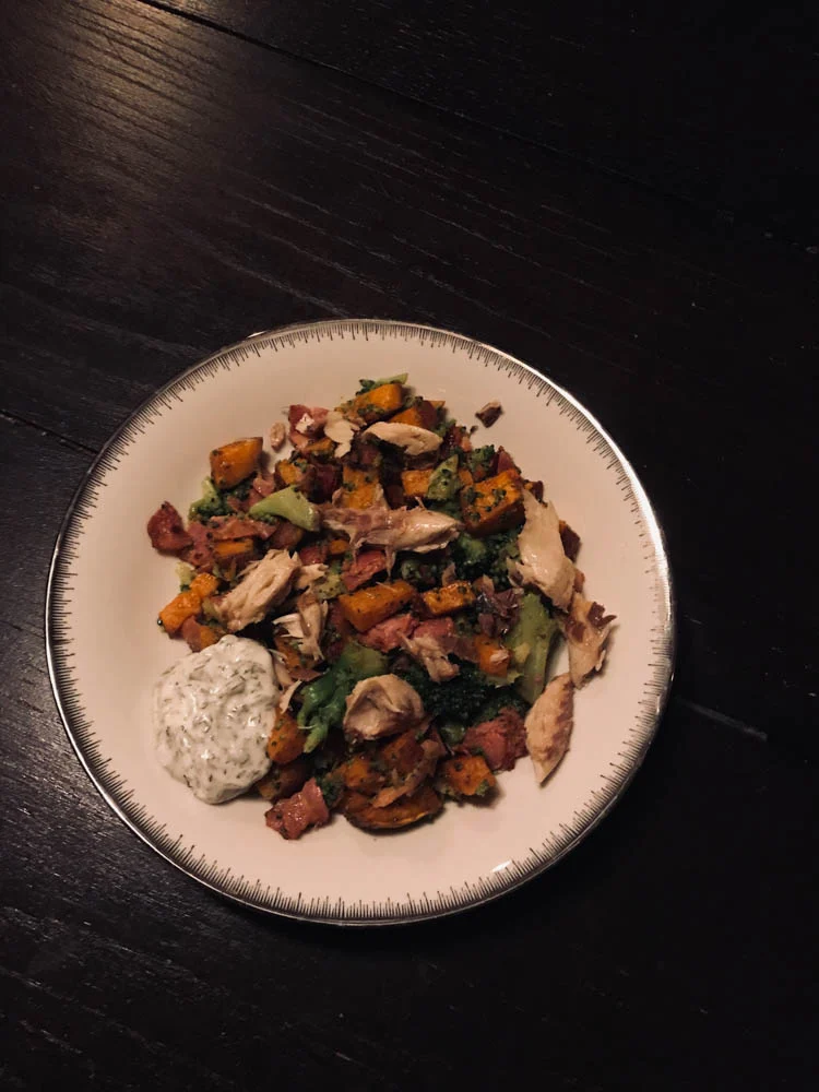 Dinsdagavond kookte ik ook gelijk voor de woensdagavond omdat ik weer vanuit mijn werk door moest naar Apeldoorn. Van de zoete aardappel stopte ik dus een bakplaat vol in de oven en deze combineerde ik voor de woensdagavond met gebakken spek, broccoli, makreel en dillemayo. Lekker smaakvol!