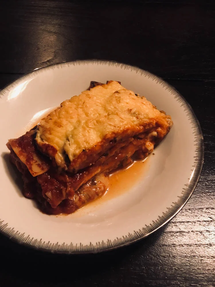 Ik heb altijd blikken tomatenblokjes op voorraad en besloot daar een lekkere saus mee te maken voor een lasagne. Die vulde ik verder met verschillende groenten en topte ik uiteraard af met een dikke laag kaas.