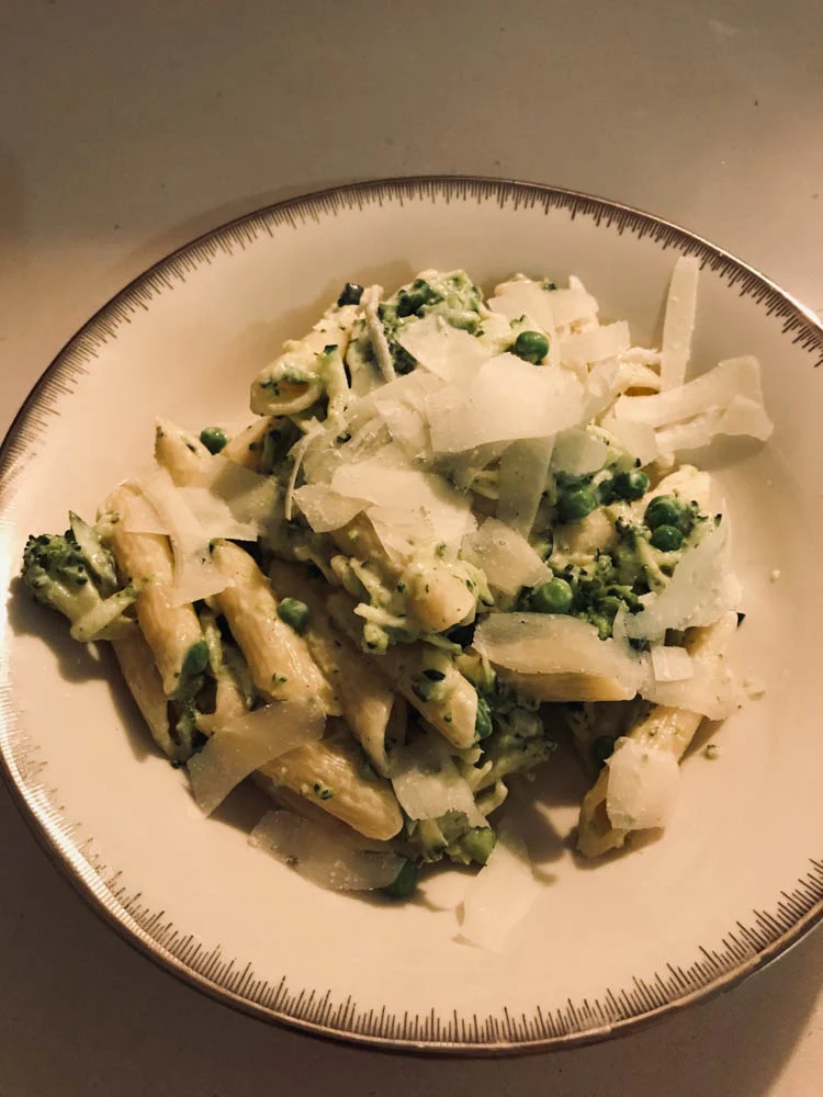 Ik had nog veel broccoli en courgette en daar wilde ik vanaf. In de vriezer hadden we nog doperwtjes liggen dus ik besloot er een pastasalade van te maken, met een mayo/yoghurt/citroendressing en wat Pecorino.