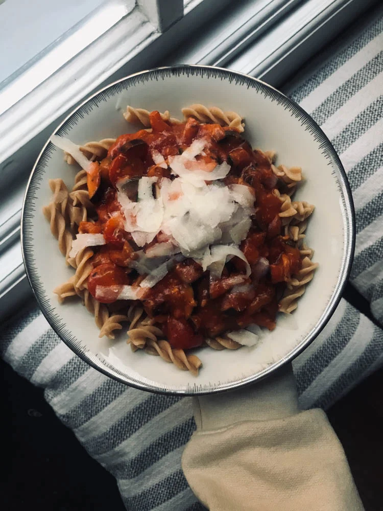 Wederom pasta, ik zei het hè? Veel comfort food. En dan zijn we er nog niet. In ieder geval; een saus die ik maakte op basis van tomato frito, old skool zoals ik dat vroeger al deed. Ook hier met groenten en op het laatst heb ik nog wat cherrytomaatjes bij de saus gegooid zodat deze nog een beetje heel blijven. Met volkorenpasta overigens.