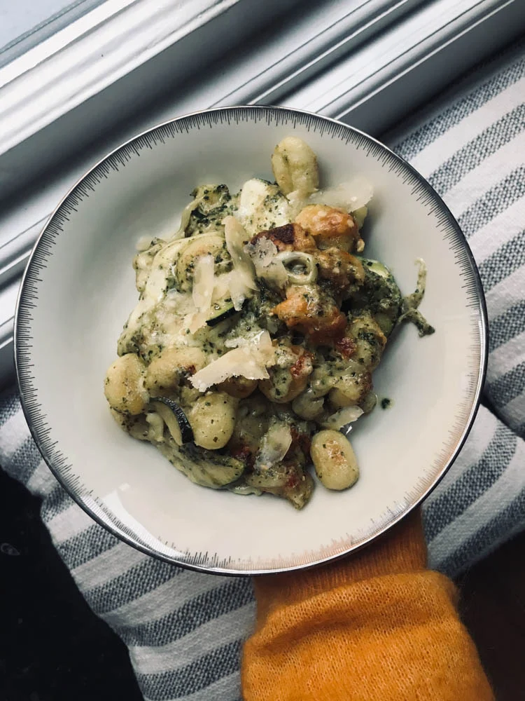 Dit was wel de topper in het rijtje comfort food van de afgelopen week denk ik. Héél lekker, ook heel machtig. Het is gnocchi met een pestosaus en mozzarella.