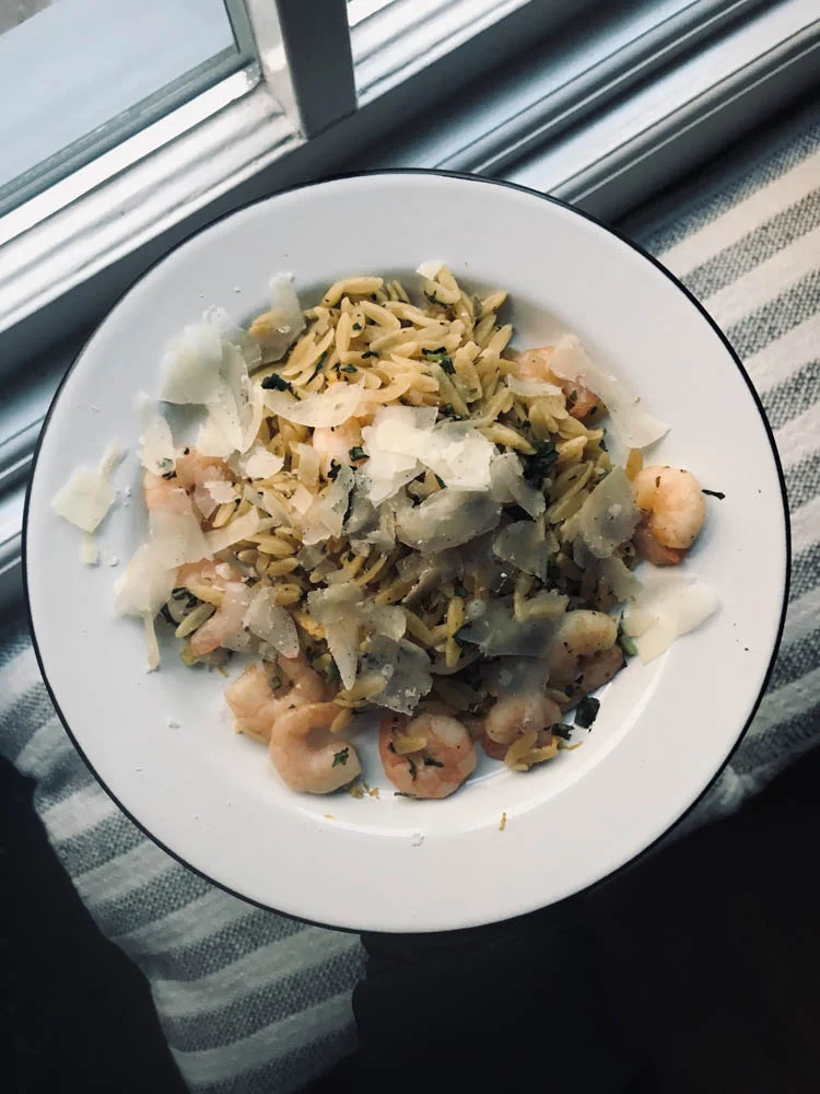 En gisteren besloot ik een gerecht met orzo te maken, o.a. met knoflook en garnalen.