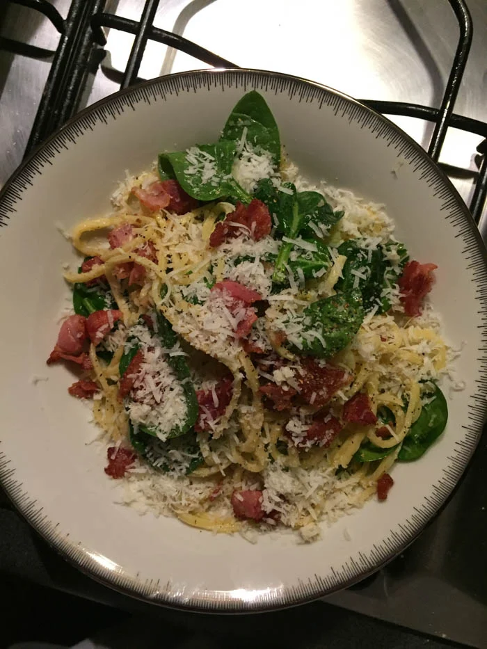 Maandag reed ik naar Nieuw Amsterdam om de voorbereidingen voor de lancering van Reishonger te treffen. Toen ik ’s middags weer thuis was heb ik nog lekker zitten werken en daarna had ik geen zin meer om de deur nog uit te gaan voor boodschappen. Ik maakte een spaghetti met wat ingrediënten die ik nog in huis had; verse spinazie, ontbijtspek, pecorino en truffelolie. Lekker!