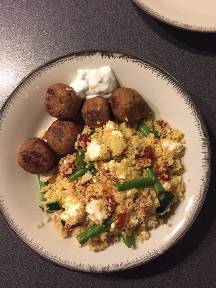 Ik deed vandaag mijn boodschappen en haalde voor het eerst falafel bij een supermarkt. Prima voor bij de couscous (met boontjes, zongedroogde tomaatjes, courgette, witte kaas en ras el hanout), maar zelfgemaakt is wel echt veel lekkerder.