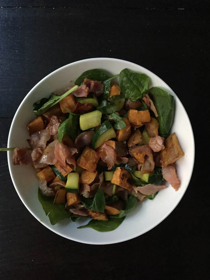 Woensdag zit al bijna in mijn hoofd als ‘lichte-maaltijd-dag’ vanwege mijn lange training die avond. Ik maakte deze keer een salade van zoete aardappelblokjes met kerrie uit de oven, spinazie, spek, courgette en een dressing van appelazijn, olijfolie, kerrie en komijn.