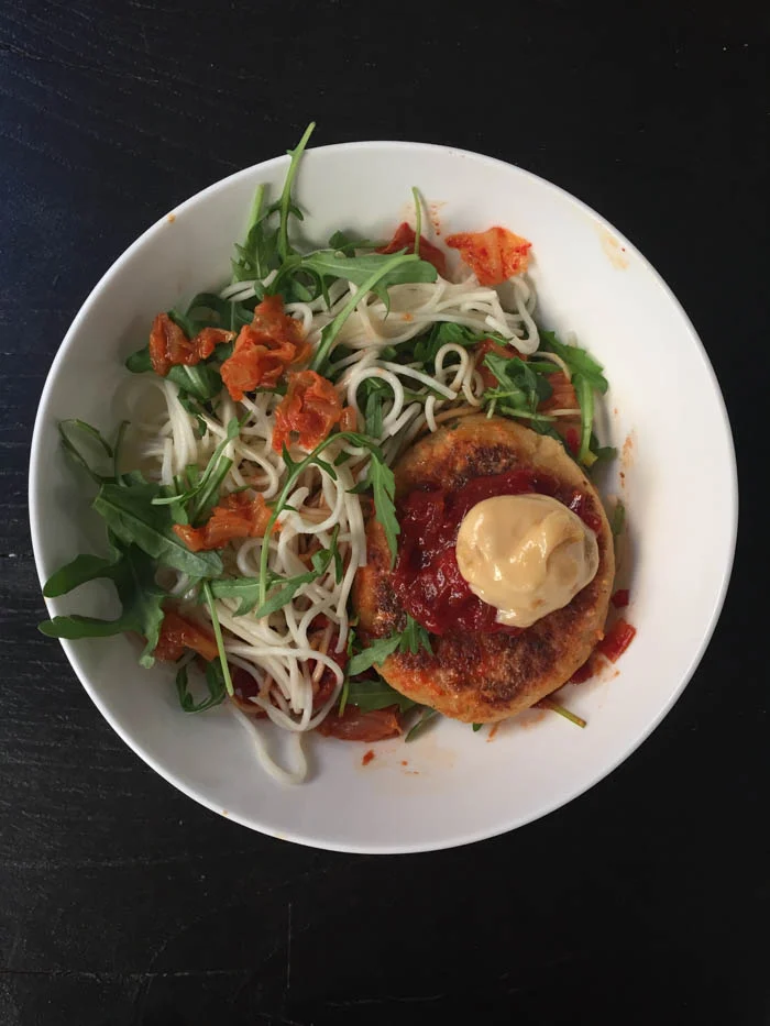 Dit rommelige bakje lag even daarvoor nog in een ietwat andere vorm mooi te wezen op een bordje. Ik maakte deze garnalenburger met noodles voor OMF en het recept komt binnenkort online. Echt comfort food dit, heerlijk!