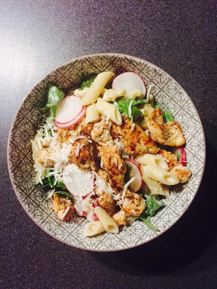 De hele middag heb ik artikelen zitten schrijven voor OMF en ineens was het al 20:00 uur. Gaat wel vaker zo. Ik had vrij laat mijn lunch gegeten dus ik had nog geen honger, maar ik flanste wel even deze pastasalade in elkaar. Manlief moest immers ook eten en uiteindelijk had ik stiekem toch wel honger. Ik maakte mijn restjes pasta op (heb altijd van die halve beetjes over) en vulde de salade met rucola, radijsjes, basilicum en met knoflookpeper gebakken kalkoenfilet. Door de pasta roerde ik eerst een mayo/citroensap/misopasta dressing. Misopasta moet je overigens echt eens kopen, heel lekker met wat mayo en met veel dingen te combineren.
