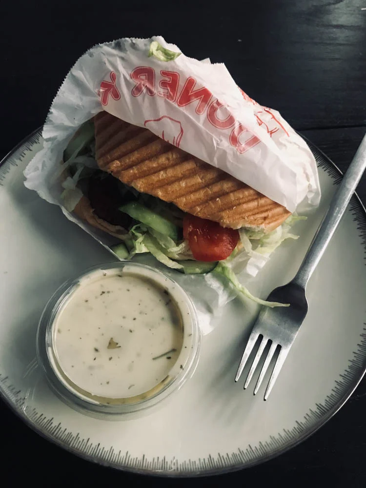 Ik had dit niet besteld hoor. Omdat ik een wijnspijs wandeling deed in Arnhem afgelopen zondag, en laat thuis was, bestelde Tobias een bak kapsalon. Daarbij nog dit broodje falafel met de gedachte; misschien heeft Viv nog trek. Stiekem nog een beetje maar niet veel, ik at het dus maar voor de helft op.