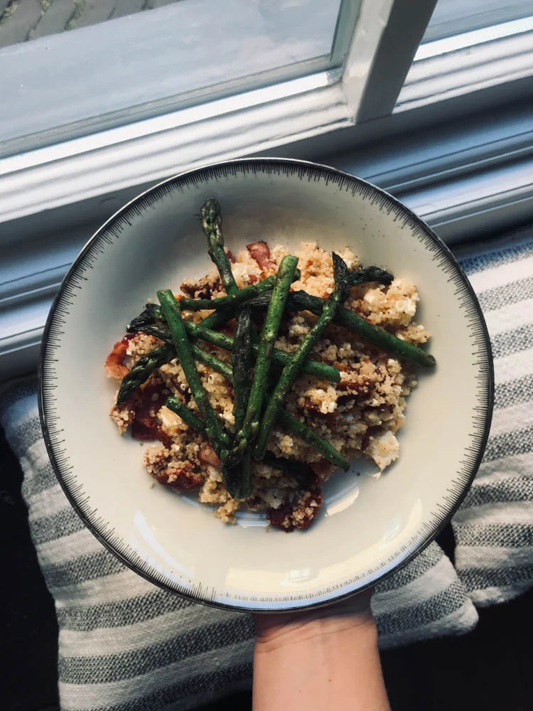 Ik maakte een lekkere couscous salade met gebakken groene aspergetips, spek, feta en zongedroogde tomaatjes.