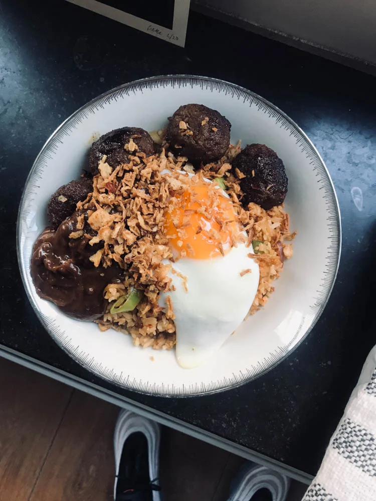Een flinke pan met nasi maakte ik, handig voor Tobias zodat hij er de volgende dag nog van kon eten. Met ketjap gehaktballen, een gebakken ei, satésaus en gebakken uitjes.
