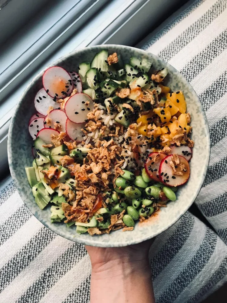 Láng geleden dit. Een flink gevulde poké bowl. Ik maakte er eentje op basis van zilvervliesrijst die ik mengde met wat sojasaus, chilisaus en sesamolie. De toppings bestonden uit radijsjes, avocado, sojabonen, mango en komkommer. M’n favoriet op deze manier. En vergeet de gebakken uitjes niet.