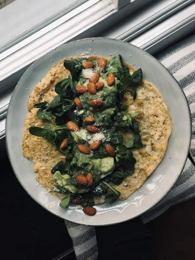 Dit is dus de eiwrap die we in Kopenhagen aten, bij een Paleorestaurant. Ik weet niet of dat restaurant nog bestaat, maar toen wij er waren aten we ook redelijk vaak Paleo. Inmiddels niet meer maar dit recept is wel erg blijven hangen. Ik heb het zelf uitgevogeld toen we daar zaten, want heel moeilijk kon het niet zijn. De vulling bestaat uit sla, zelfgemaakte pesto, avocado/citroencrème en amandelen. Héél smaakvol.