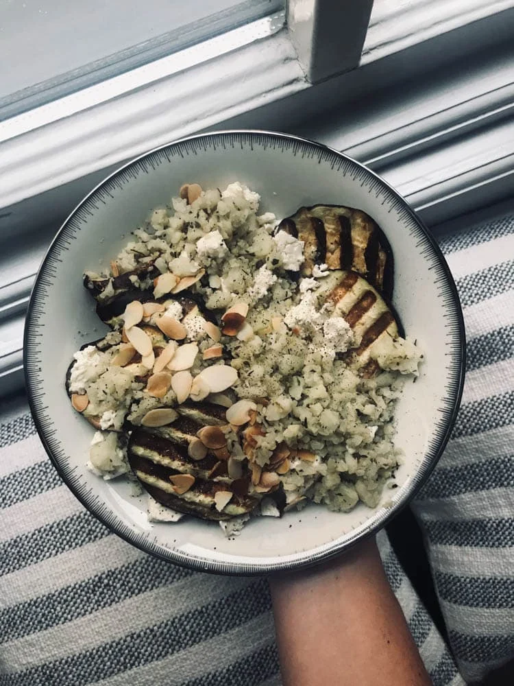 Ik maakte weer eens bloemkoolcouscous, bakte deze op met rozemarijnolijfolie en peper en zout. Daarbij grilde ik aubergine. Alles samen met wat feta en geroosterd amandelschaafsel. Simpel en een behoorlijk gezonde maaltijd. Deze is het.