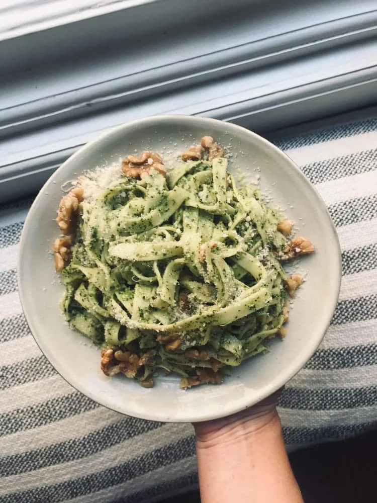 Tagliatelle eten wij niet vaak, maar ik besloot het weer eens te maken. Met rucolapesto en walnoten. Súper smaakvol! En een flinke vuller.