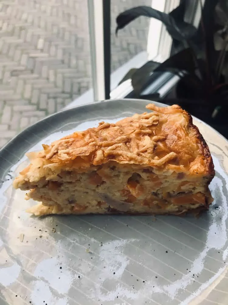 Gisteren sloten we onze eetweek af met een zelfgemaakte hartige taart. Met filodeeg, zoete aardappel en heel veel oude kaas. Ook een flink bommetje maar erg lekker.