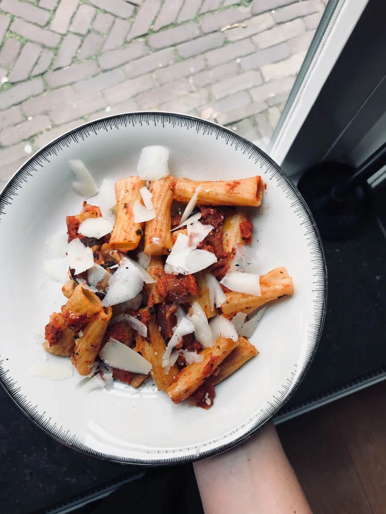 We aten dinsdag een lekkere pasta met gegrilde aubergine en wat pecorino. Heer-lijk.