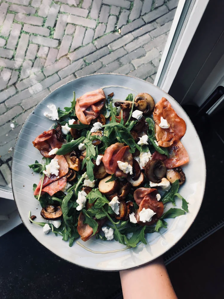 Ik maakte een salade met veel bacon in citroensap, olijfolie en een beetje knoflook gebakken. Met gebakken kastanjechampignons, rucola, geitenkaas en een beetje honing. Bacon en honing = TOP.