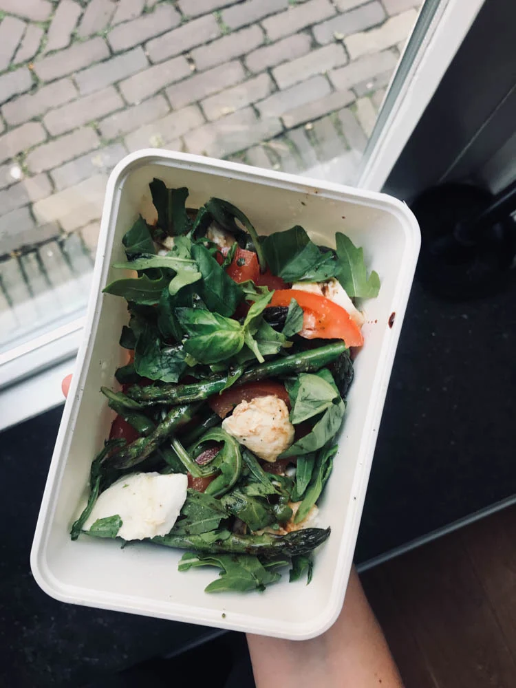 Op vrijdag heb ik altijd vrij en besteed ik mijn tijd aan freelance klussen. Afgelopen vrijdag was ik weer lekker voor OMF bezig en zoals altijd kom ik aan het einde van de dag in tijdnood (ik wil altijd teveel op 1 dag doen én kan dan zo lekker in de OMF-flow zitten dat ik de tijd niet meer in de gaten heb). Het avondeten werd dus even in een recordtempo gemaakt en deed ik snel in bakjes zodat we het in de auto op konden eten of in mijn geval, bij the Barbell Club. Ik had daar namelijk een paar uurtjes te overbruggen. Het werd een salade van mozzarella, tomaat, rucola, basilicum en groene aspergepunten met een beetje balsamico azijn, olijfolie en peper en zout.