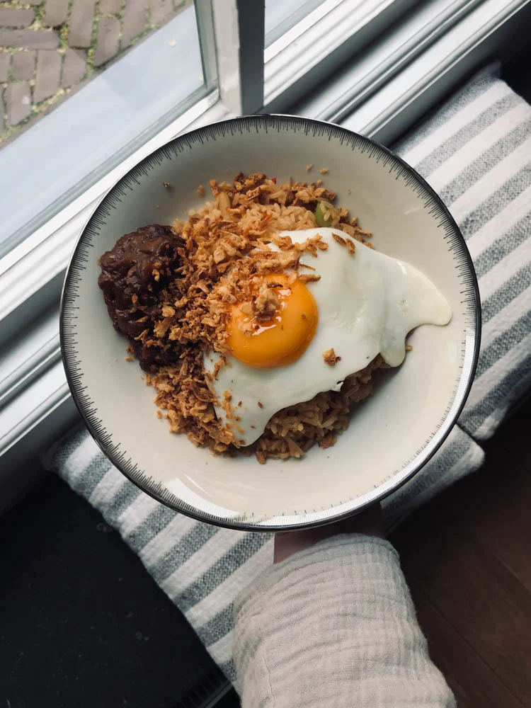 Het stond al even op de planning maar maandag maakte ik het dan eindelijk; een flinke pan nasi. Met gember, knoflook, rode ui en een rode peper. Met uiteraard satésaus en een gebakken eitje. Gebakken uitjes er bovenop!