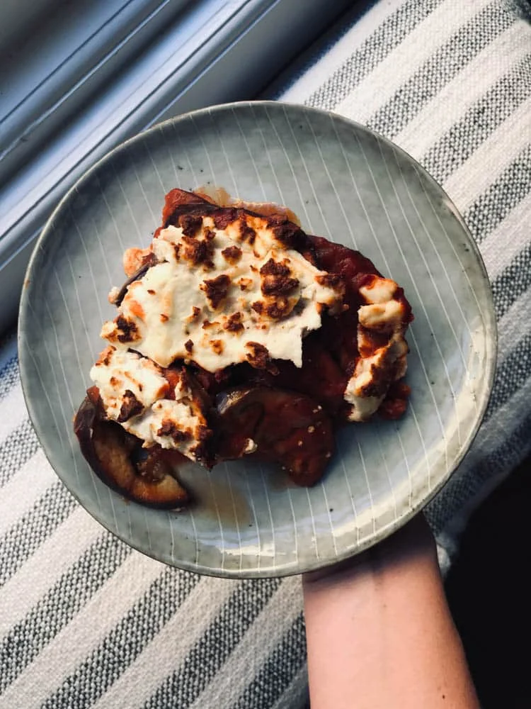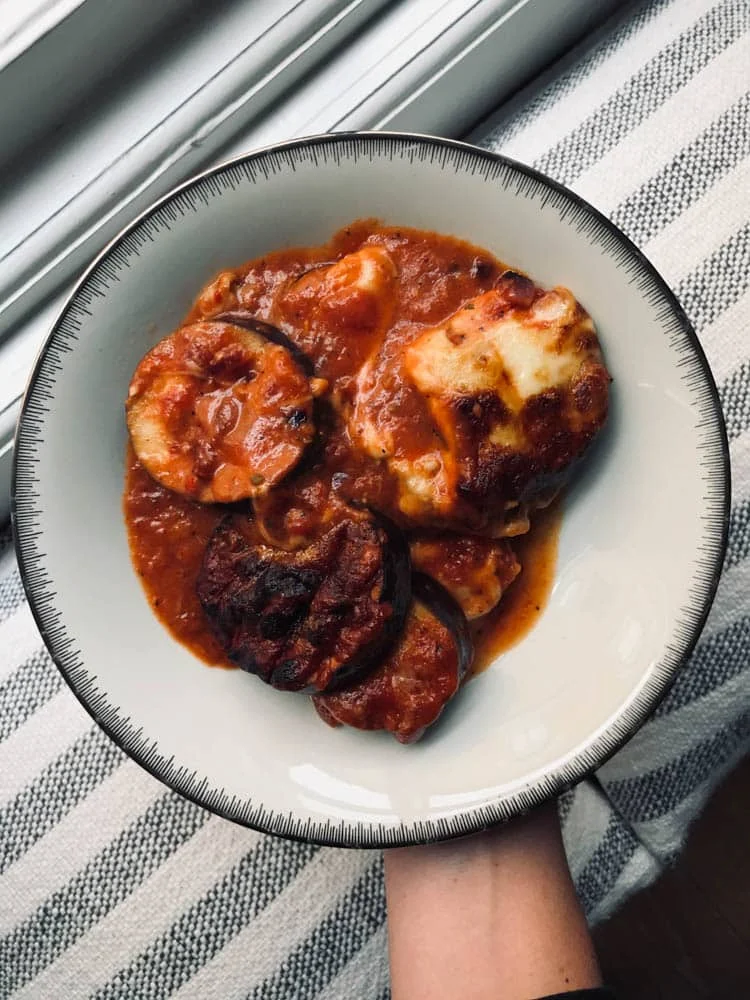 Tobias at een overgebleven bordje met curry, en ik had heel veel zin in Melanzane, een Italiaans gerecht met Parmezaan en aubergine. Dus eigenlijk maakte ik een ovenschotel met dit gerecht alleen voor mezelf maar het was het waard. Heer-lijk!