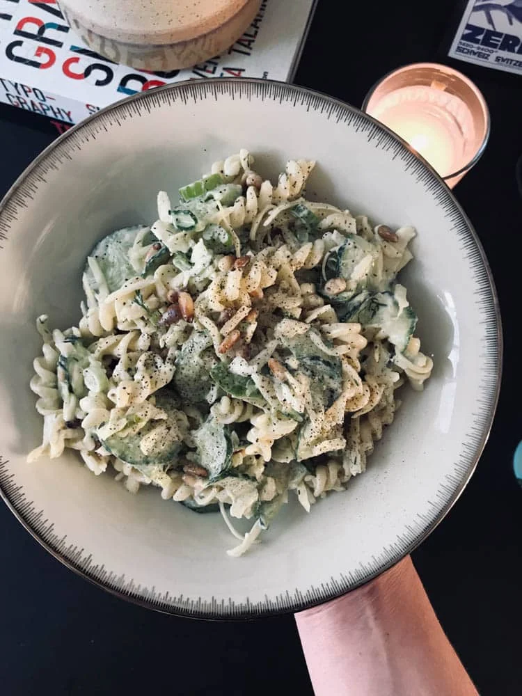 We hadden nog een schaaltje met deze romige pastasalade met onder andere komkommer, kool en een hele lekkere dressing in de koelkast staan en die moest echt op. Anders kon het de prullenbak in en dat wil ik altijd zo min mogelijk laten gebeuren. Dus we kookten niet, ook wel ideaal.