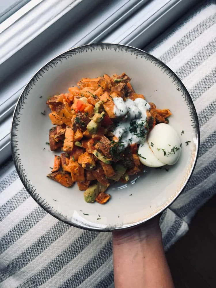 Wij hebben een periode gehad dat we heel regelmatig deze zoete aardappelsalade aten. Oorspronkelijk met bacon erdoor maar omdat Tobias het liefst vegetarisch eet en het mij niet uitmaakt, maakte ik er een iets andere variant van. De bacon bleef weg, maar de mayo/citroen/dilledressing bleef. Ik vulde het verder aan met rode paprika en avocado.