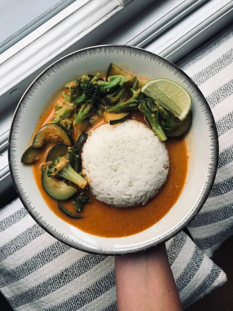 Ja, Thailand dus. Op woensdag. En dat was heel lekker. Een rode curry met courgette, kleine broccoli roosjes en pandanrijst. En ik heb inmiddels de conclusie getrokken dat er écht verschil in zit of je de rijst in zo’n bolletje op je bord legt, of gewoon opschept en daar de curry overheen giet. In dat laatste geval trekt de curry namelijk veel meer in de rijst, dus op bovenstaande manier is lekkerder!