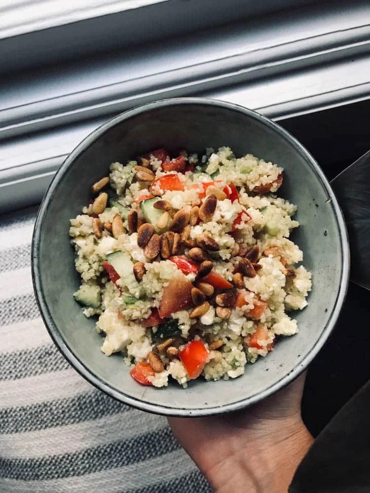 Een simpele afsluiter van de week en wel met iets dat ik al heel lang niet meer had gemaakt. Onze couscoussalade met feta, komkommer, paprika, citroen, olijfolie, peper, zout en pijnboompitjes.