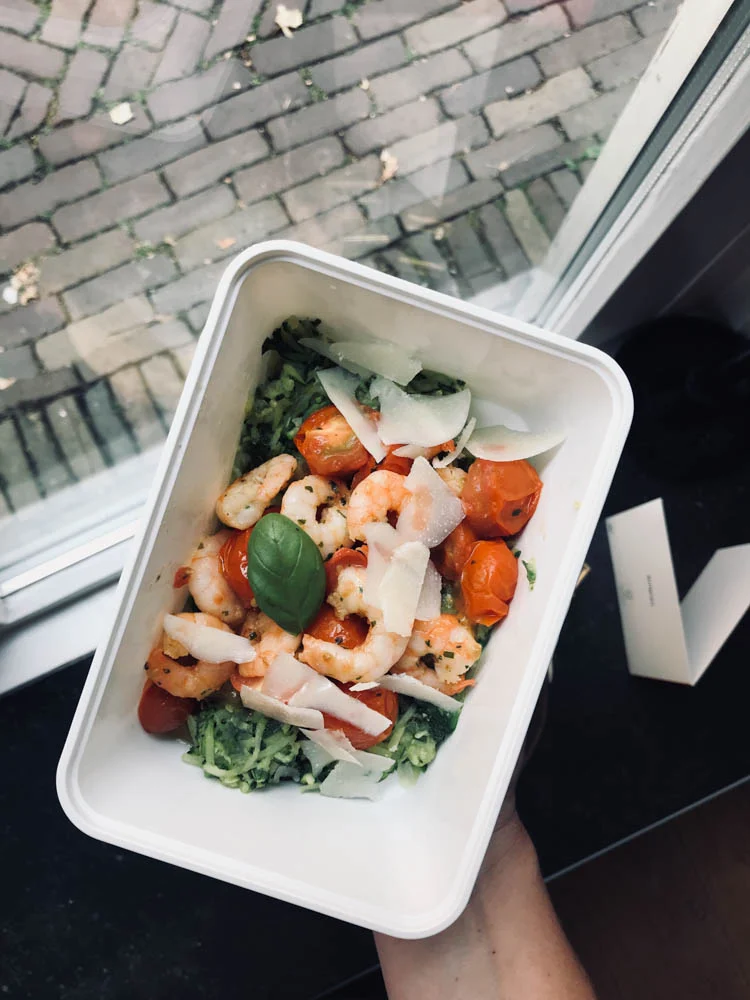 We moesten vroeg in de avond weg dus ik nam mijn avondeten mee in een bakje. Heel lekker dit: courgetti met basilicum, cherrytomaatjes en garnalen in knoflookolie. Met een beetje pecorino erover.