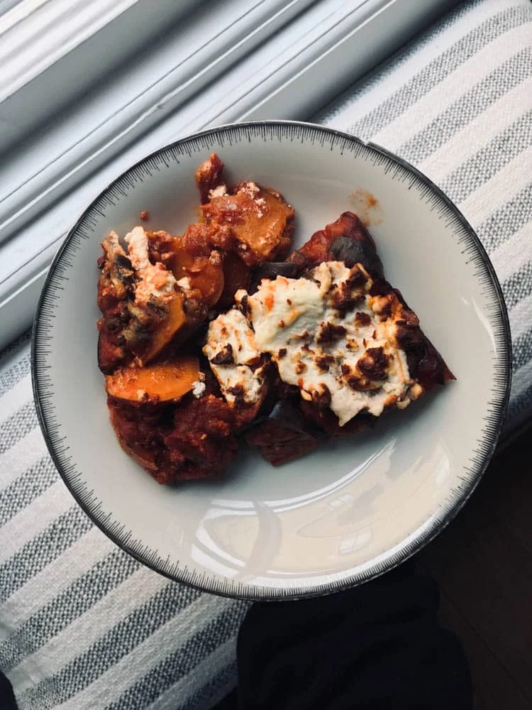 Ik kookte niet, maar haalde een paar bakken met een ovenschotel uit de vriezer. Ik was helemaal vergeten dat ik die er nog niet zo lang geleden in stopte, en het kwam wel even goed uit om niet te hoeven koken. De vulling bestond uit o.a. zoete aardappel, tomatensaus en ricotta.