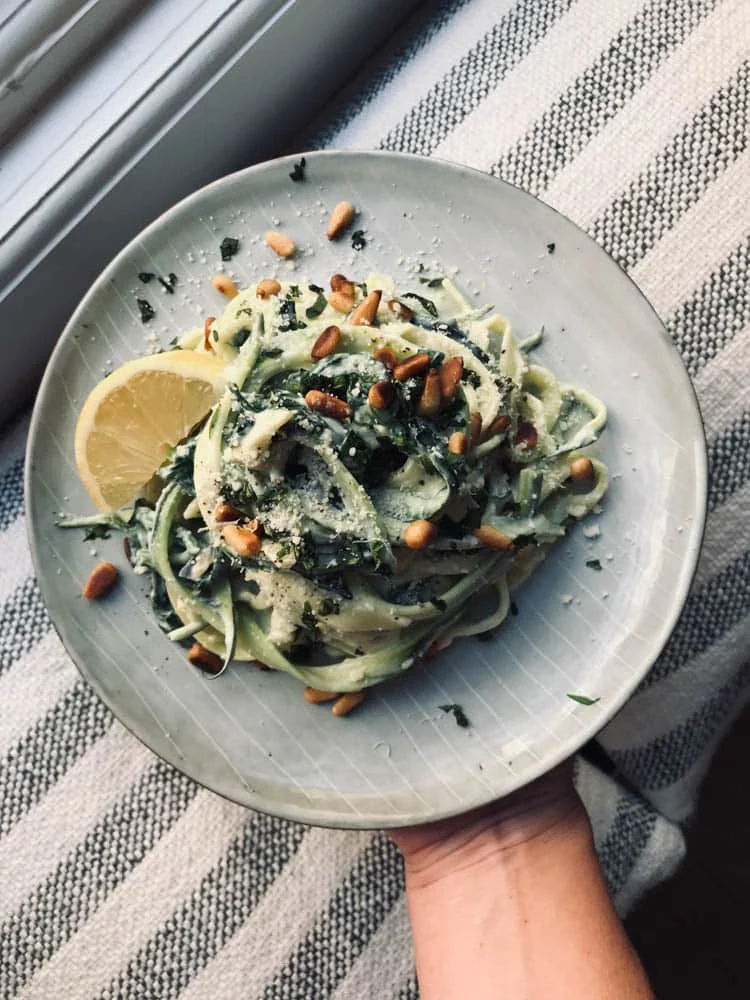 Ik had het niet gepland staan, maar ik maakte vrijdag toch twee dingen voor OMF waaronder deze courgetti met spinazie. En nog een heleboel meer. Een lekker zomers gerecht dus binnenkort online! Wij aten ‘m lekker vroeg als avondeten.