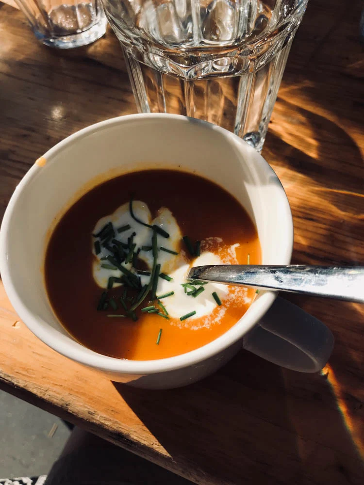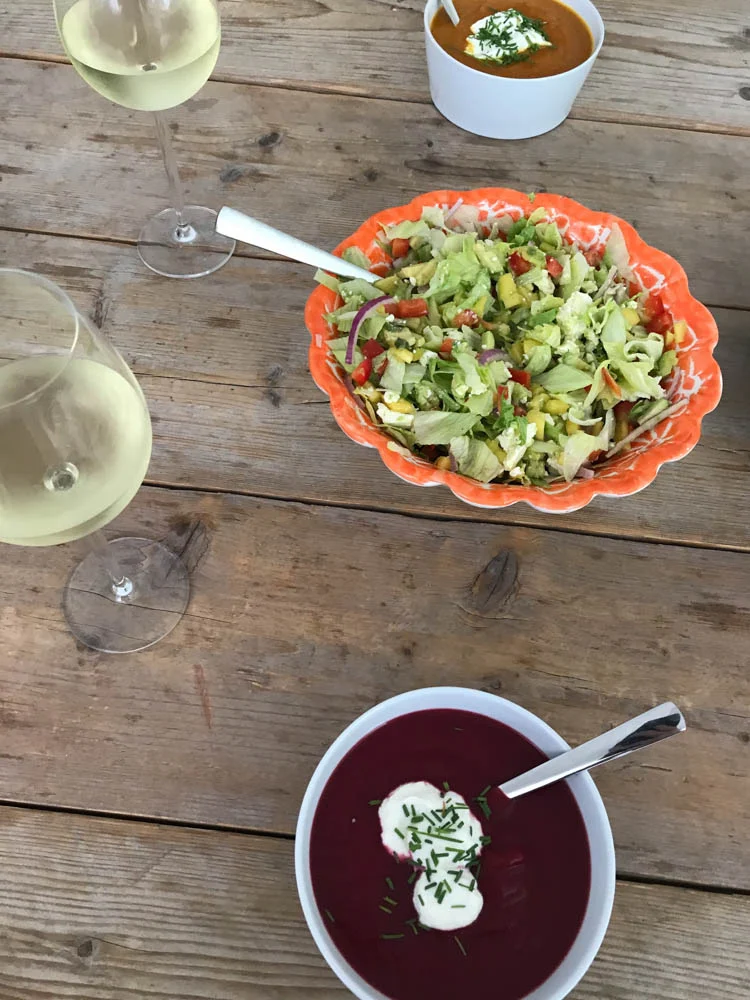 Ik at vrijdag weer bij vriendin Sanne omdat we die avond naar een festival gingen. Ik at rode bietensoep, Sanne nog een keer de Marokkaanse soep en erbij nog wat salade met o.a. mango, avocado en limoen.