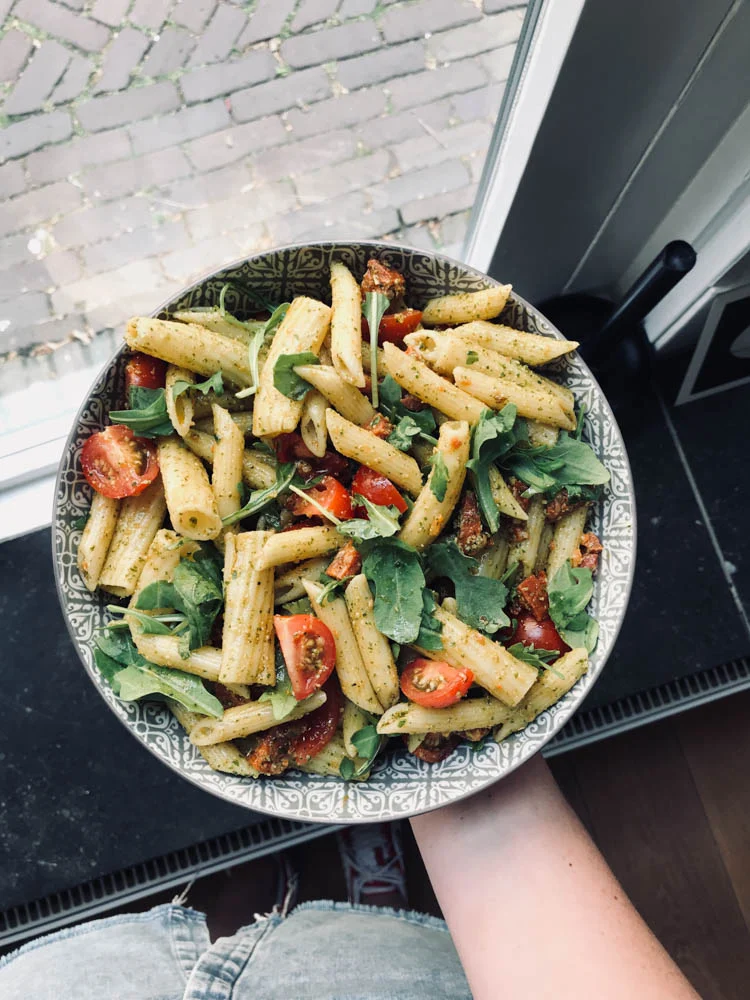 Pastasalade met rucolapesto, rucola, tomaatjes en chorizo. Lekker zomers.