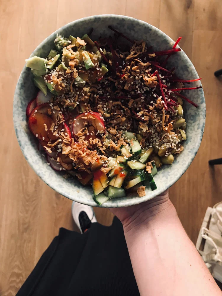 En pokébowl op basis van quinoa. Gevuld met o.a. rode biet, komkommer, avocado en sesamolie.
