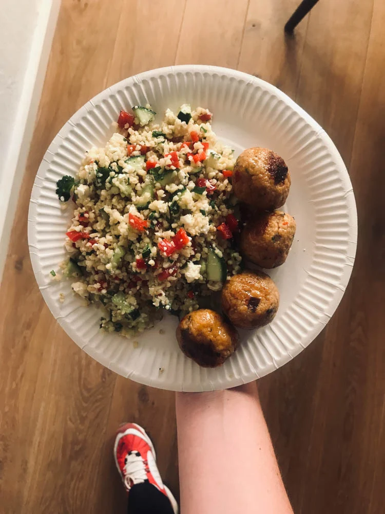 Tobias haalde op mijn verzoek een zak gekookte bulgur en een zak Thaise gehaktballetjes uit de vriezer. Die balletjes kun je prima koud eten en de bulgur gebruikte ik om een Thaise salade mee te maken. Met limoensap- en rasp, paprika en koriander.