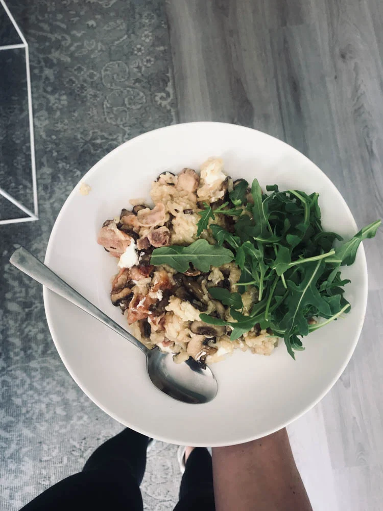 Vriendinnetje Suus kookte vrijdagavond voor heel lekker voor ons; risotto met champignons, geitenkaas, bacon en rucola. LOVE risotto. Ga ik snel weer maken als die keuken erin zit.