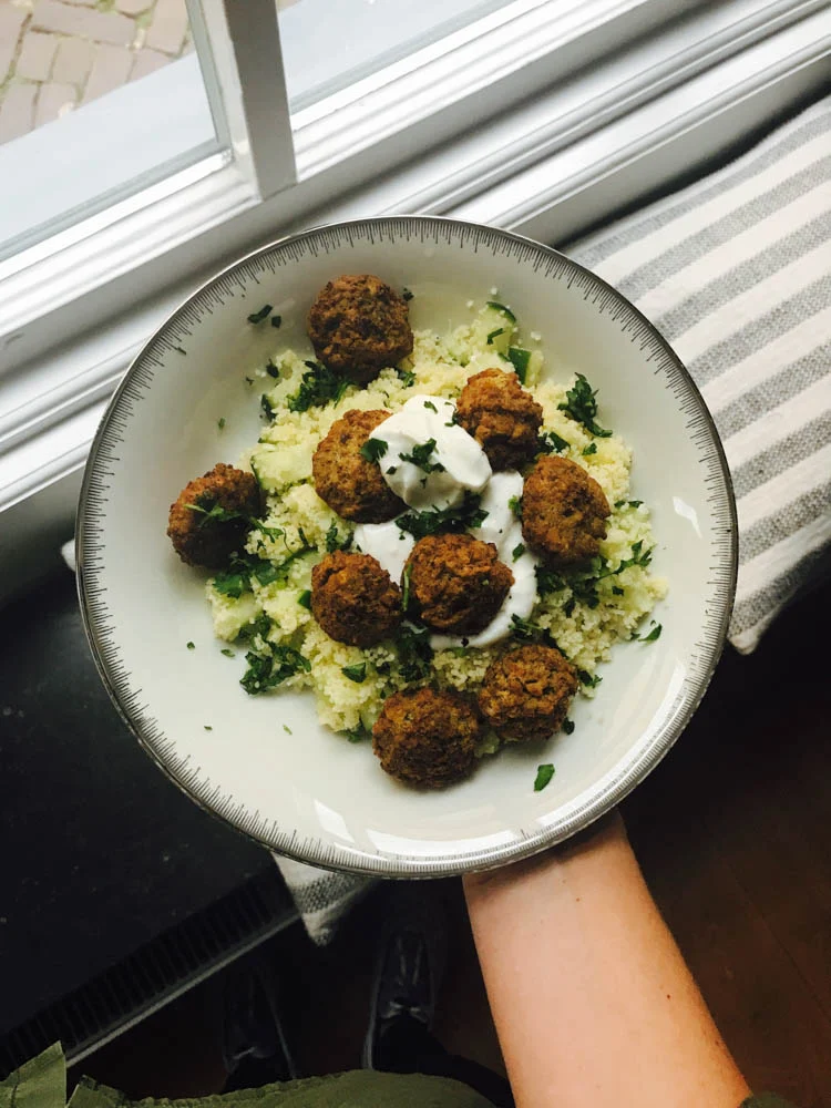 Supersnel, supermakkelijk; couscous met citroenrasp en -sap, olijfolie, lente-ui en komkommer. Daarop wat falafel balletjes met een beetje knoflookyoghurt. En een beetje koriander, maar alleen voor mij want net als Sabine is ook mijn man daar niet gek op.