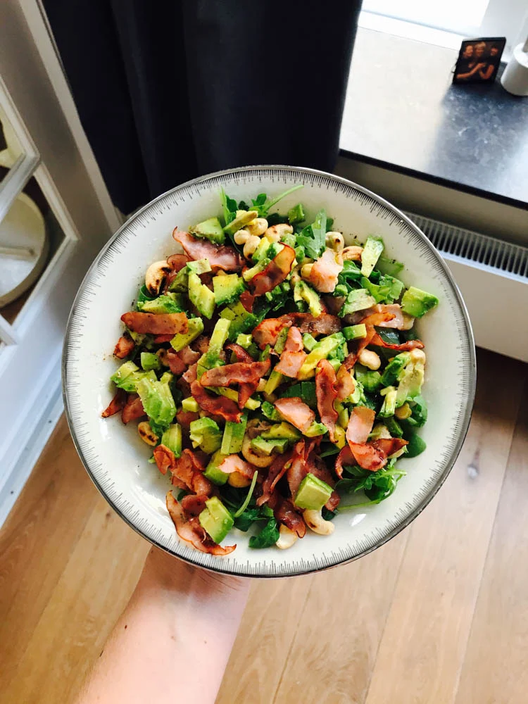 Tobias had deze avond een bbq dus ik at alleen. Ik wilde die avond nog gaan trainen dus ik maakte een salade van rucola, geroosterde cashewnoten, avocado en bacon. Erover een beetje olijfolie, citroensap en peper.
