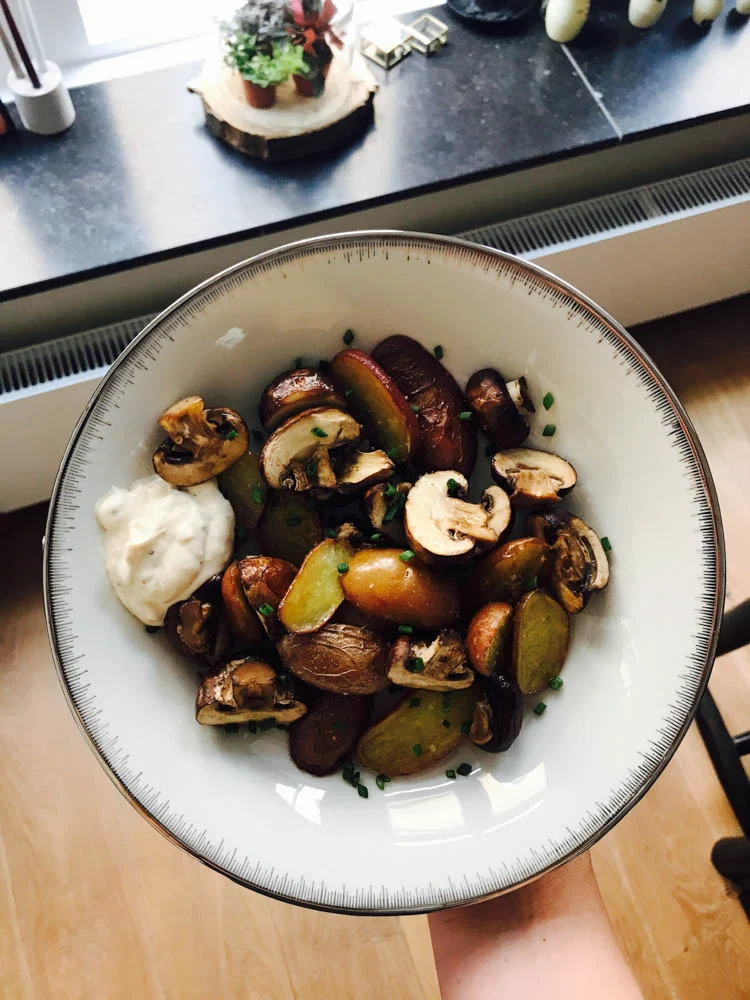 Tussen de eerste no-bake taarten die ik maakte door, moest ik nog even iets te eten klaarmaken en ook nog op tijd want manlief moest om kwart voor 6 weer weg (ik ben altijd een late eter). Ik husselde wat aardappeltjes en kastanjechampignons door olijfolie en zeezout en mikte ze daarna in de oven. Half uurtje laten gaan op 230 graden en vervolgens alleen nog maar opscheppen. Ideaal. Lekker met een beetje truffelmayonaise en verse bieslook.
