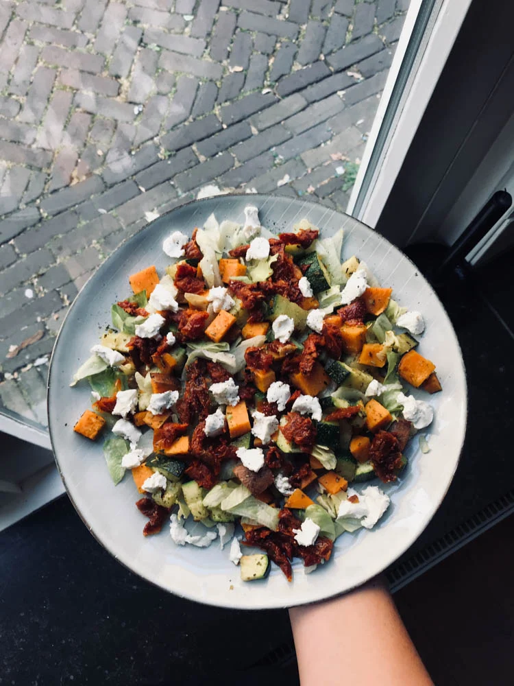 Ik maakte dinsdag een hele lekkere lauwwarme salade van zoete aardappel en courgette uit de oven (gemarineerd in een laagje olijfolie en wat Griekse kruiden) en ijsbergsla, zongedroogde tomaatjes en geitenkaas.