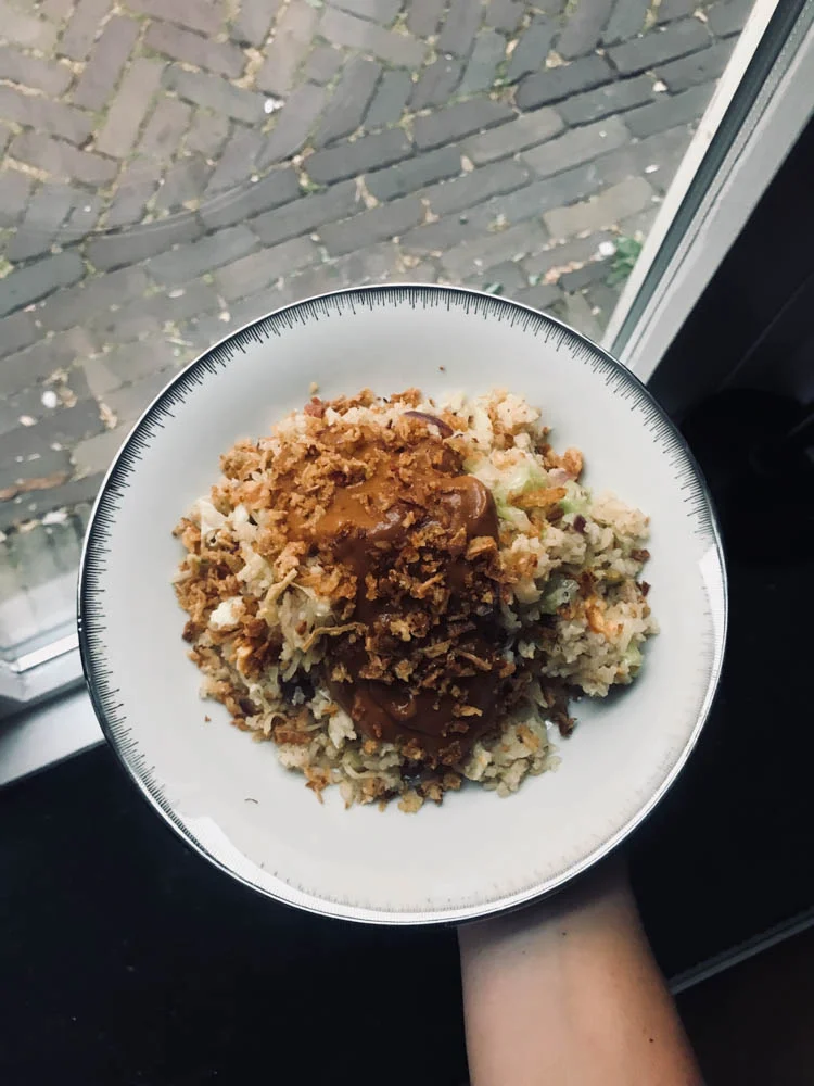 We waren laat thuis woensdagavond maar er moest nog wel even gegeten worden. Ik maakte een pan nasi. Lekker met gember, knoflook, ui en sambal als smaakmakers. Witte kool en gebakken ei erdoorheen en natuurlijk met satésaus en gebakken ui.