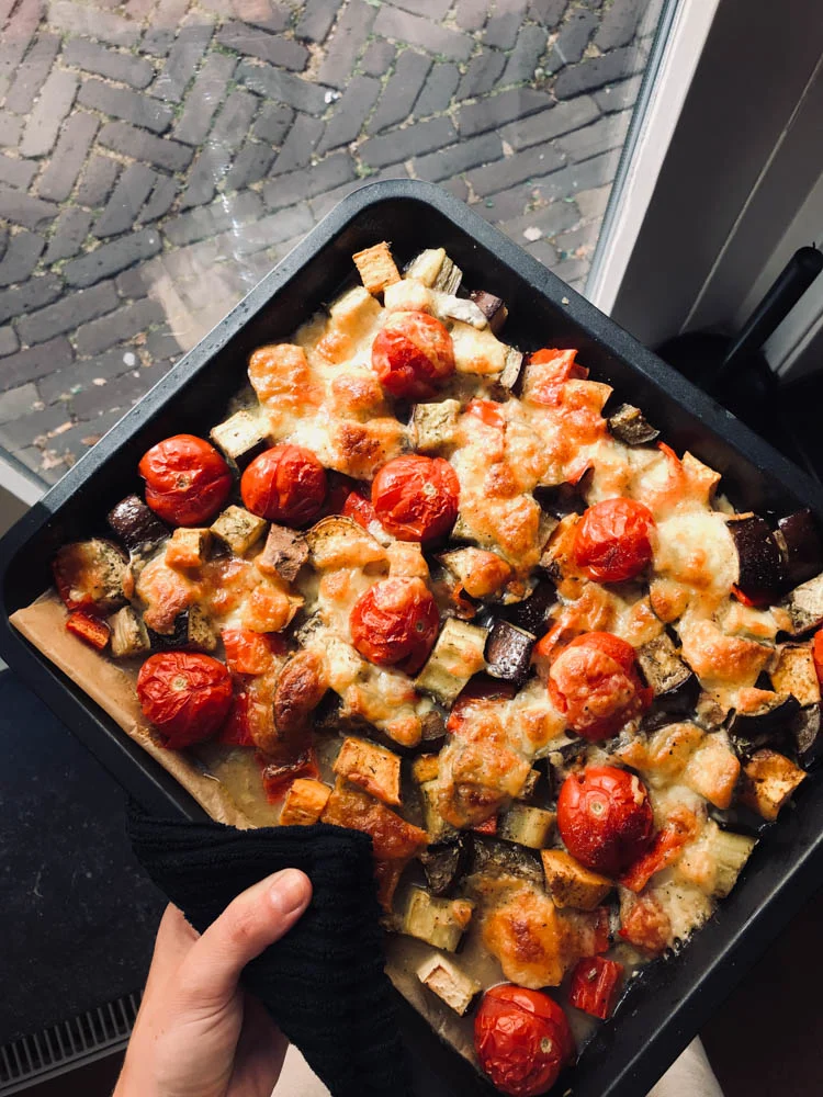 Dit soort maaltijden vind ik dus heerlijk. Makkelijk te maken, gezond en heel erg lekker. Ik deed grote stukken zoete aardappel, zoete puntpaprika, aubergine, courgette en middelgrote trostomaten in de oven. Alles onder een laagje mozzarella (en natuurlijk wat olijfolie en kruiden).