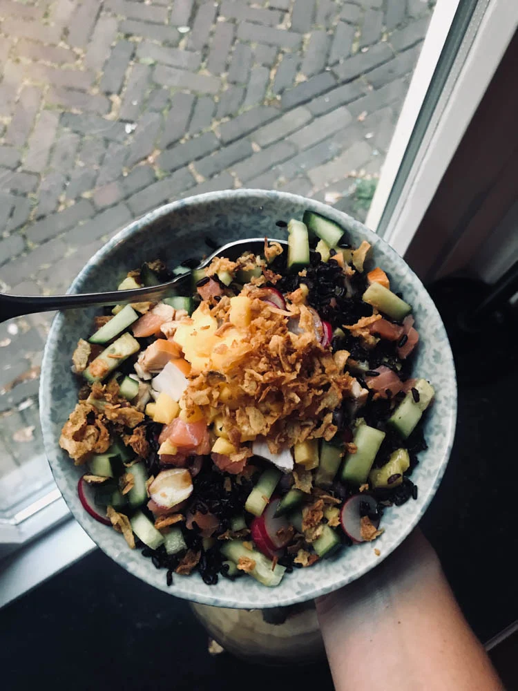 Tobias was gisteravond niet thuis dus ik at alleen. Maar ik had werkelijk geen idee waar ik zin in had (kán ermee te maken hebben dat ik vrij laat nog een stuk cheesecake at, waardoor ik geen honger had). Uiteindelijk ben ik even naar de AH gereden om wat lekkers uit te zoeken, iets makkelijks wilde ik maken. Sterker nog, eigenlijk wilde ik helemaal niet koken. Maar toch kwam ik thuis met verse zalm en mango, radijsjes en gerookte kip. Toch het lekkerst als je het zelf even maakt nietwaar? Een pokébowl salade, het lijkt wel het vaste gerecht wat ik maak als ik alleen eet. Nouja, is immers ook gewoon favoriet!