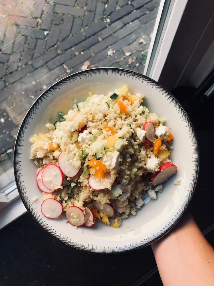 Ik heb gewoon altijd couscous in huis. Het is iets wat je in een handomdraai gemaakt hebt en met dit weer is het een lekkere lichte maaltijd. We hadden van onze weekendboodschappen (vanwege ons uitstapje) veel groen voer over en dat mocht wel op. Dus we sneden alles klein en maakten er een couscoussalade van. Deze keer met gele en oranje paprika, radijsjes, komkommer en witte kaas. En uiteraard met een lekker olijfolie, citroenrasp en sap en peper en zout.