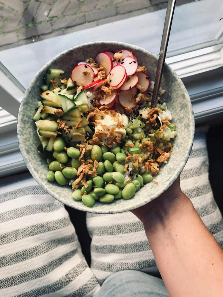 Ik maakte voor ons een pokébowl, een favoriet hier in huis. Met o.a. sojabonen, radijsjes, komkommer, chilisaus, sesamolie en gebakken uitjes.