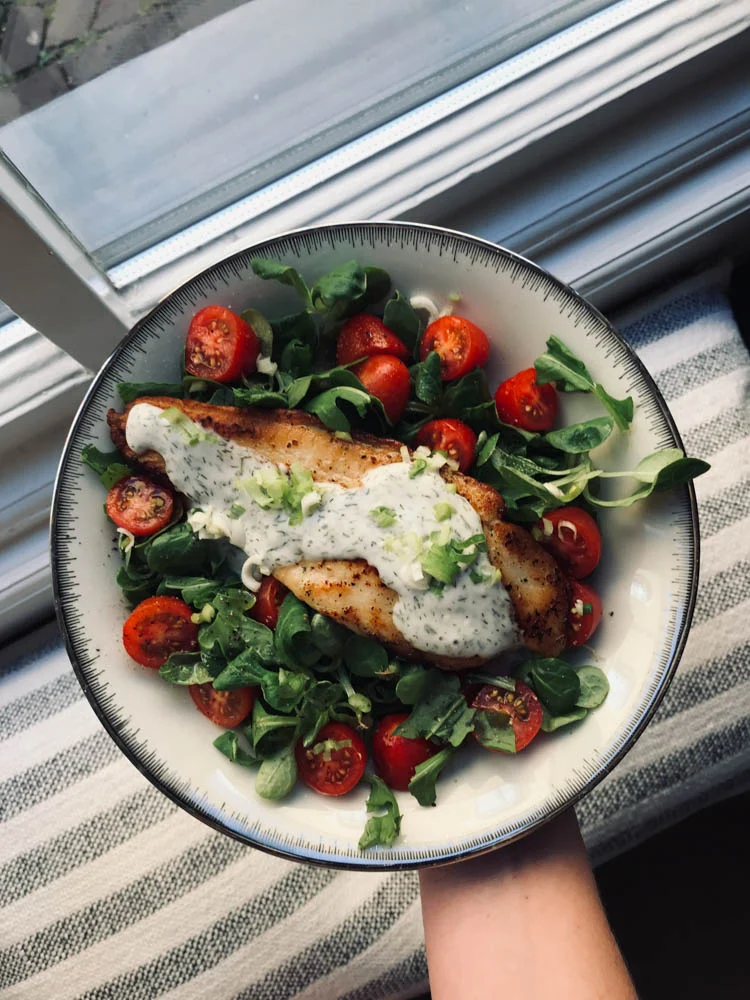 Ik bakte twee witte visfilets en maakte daar een citroen/dillesausje bij. Met een salade eronder.