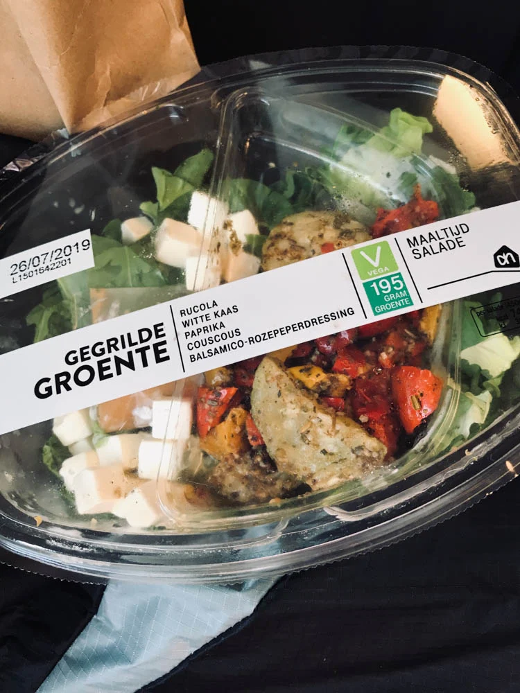 Ik was woensdag een dagje in Amsterdam en had eigenlijk bedacht op de terugweg ergens een pokébowl te scoren. Helaas kwam ik alleen maar een patatzaak en een broodzaak tegen, twee dingen waar ik helemaal geen zin in had. Dan maar even de AH to go in voor een salade.