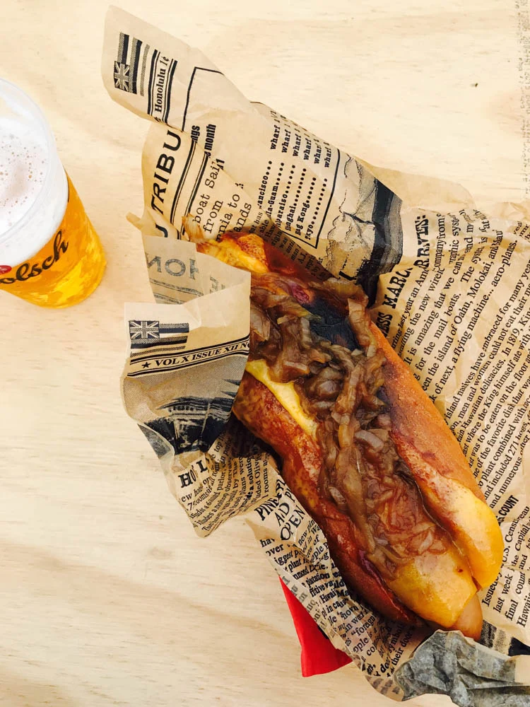 Gisteren was ik op een klein festival in Deventer en daar was 1 kraam waar je wat te eten kon bestellen. Gelukkig wel een kraam met ontzettend lekker eten. Ik bestelde deze hotdog met bacon, cheddar en gekarameliseerde ui.